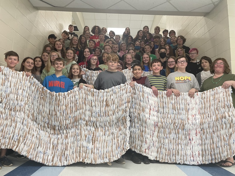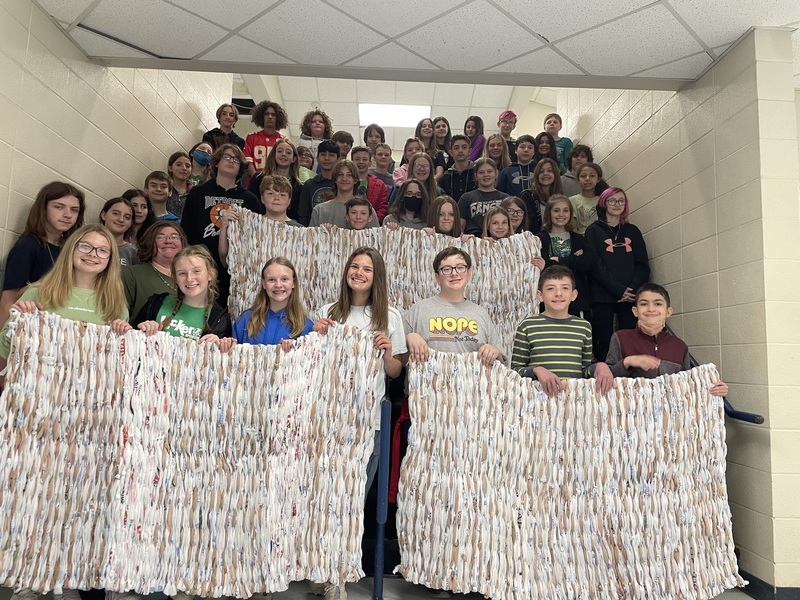 Mrs. Tara Camp's FCCLA and Family Consumer Science Investigation students at Pinkston Middle School have been working on a recycle project that has grown into a community service project. The students have been weaving used plastic grocery bags into sleeping mats for homeless in our community. They have finished four mats and are working on the fifth. Each mat requires around 700 bags to be cut into loops and connected to make a long plastic yarn. Then, the yarn must be weaved into a mat. They have worked very hard, and we are so proud of them!